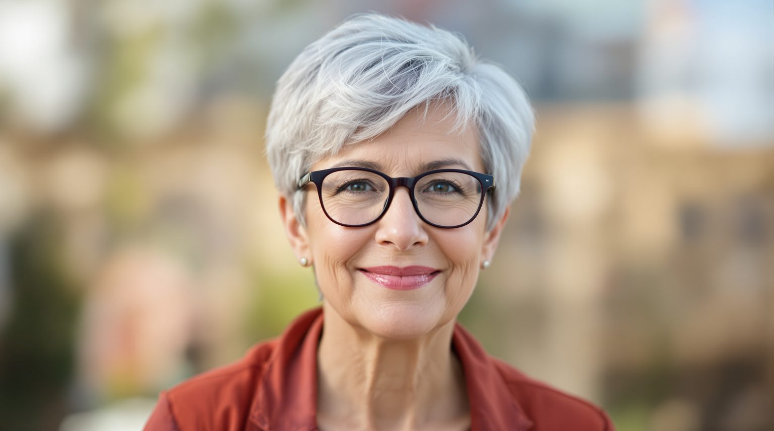 Les tendances coiffure 2025 pour visage rond, cheveux courts, femme 60 ans avec lunettes